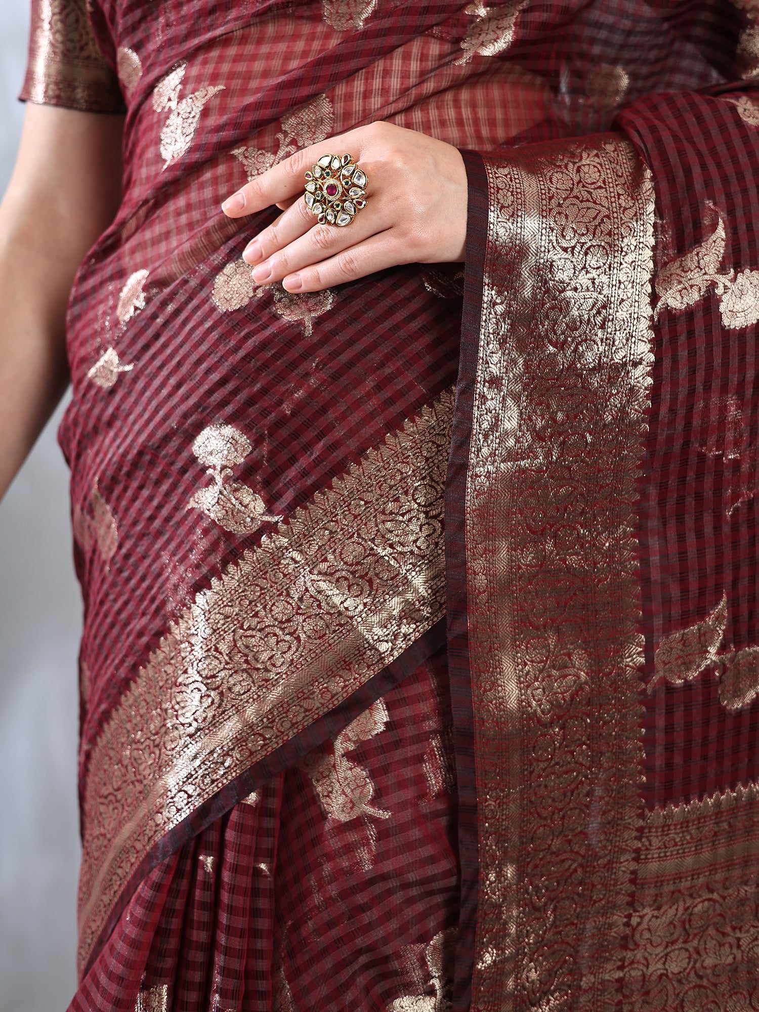 Elevate your festive wardrobe with this elegant Maroon Banarasi Chanderi Saree. Designed with delicate gold zari booti motifs and a richly woven Banarasi border, it offers a refined traditional look. Lightweight and easy to drape, this saree is ideal for weddings, festive occasions, family functions, and cultural gatherings.