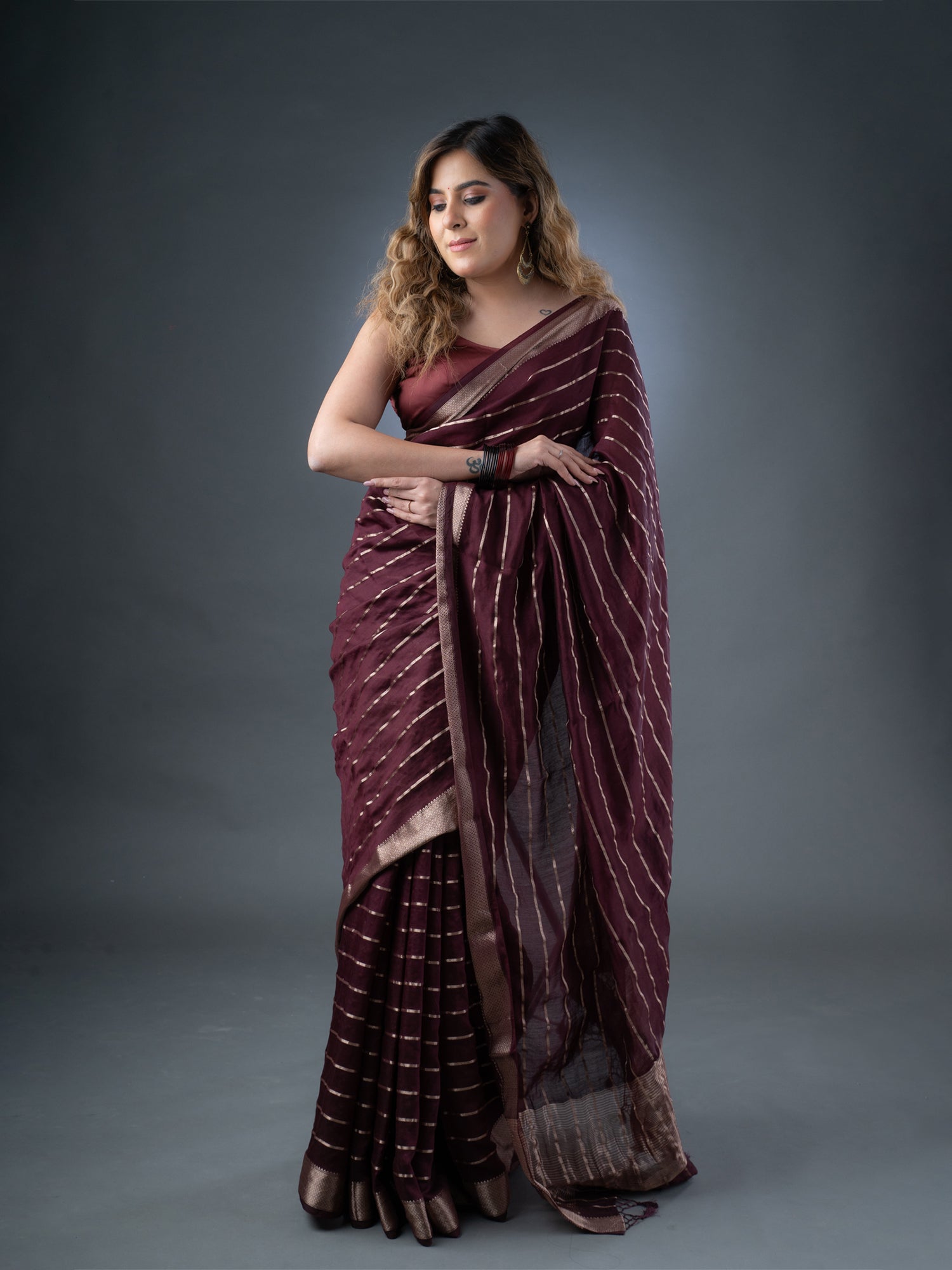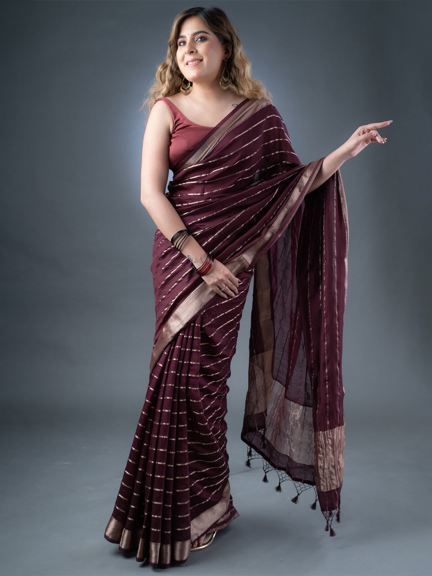 Turn heads with theΒ Wine Assam Silk Saree, crafted from a soft and flowy material for unmatched comfort. This lightweight and easy-to-manage saree features exquisite zari-woven lines and a beautifully detailed chit pallu, making it a perfect choice for small functions, events, or everyday elegance. Its rich wine color adds a regal touch, while the fabric's all-weather suitability ensures you stay stylish and comfortable no matter the occasion. Pair it with minimal gold or silver accessories to let the saree shine as the center piece of your look.