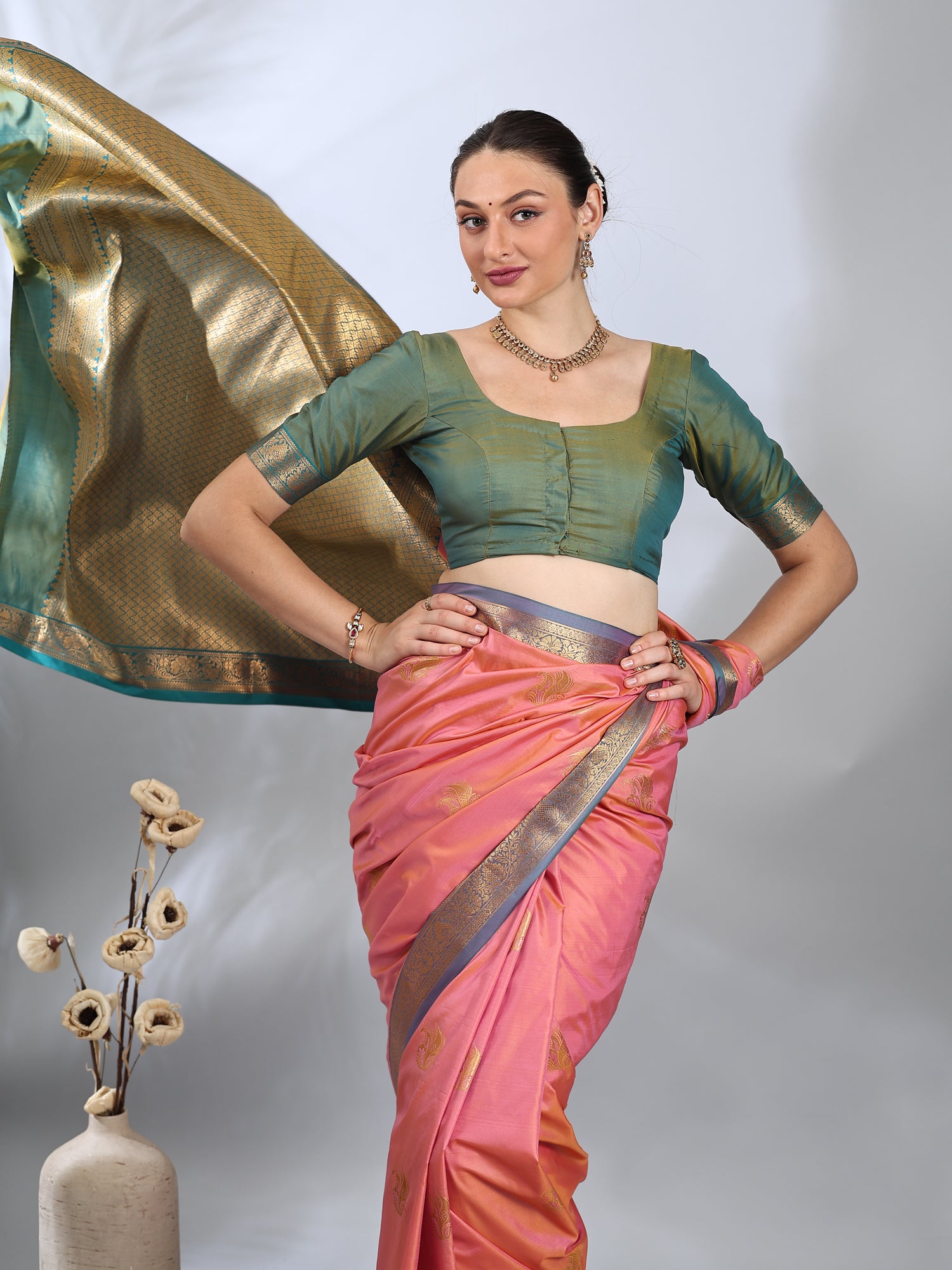 Step into timeless elegance with this Coral Pink South Silk Saree, adorned with rich gold zari booti intricately woven across the body. The saree features a beautifully crafted gold zari border and a heavily designed pallu showcasing fine golden brocade patterns. Smooth, glossy, and luxurious in texture, this saree offers a regal appeal, making it an ideal choice for weddings, festive occasions, and grand celebrations.