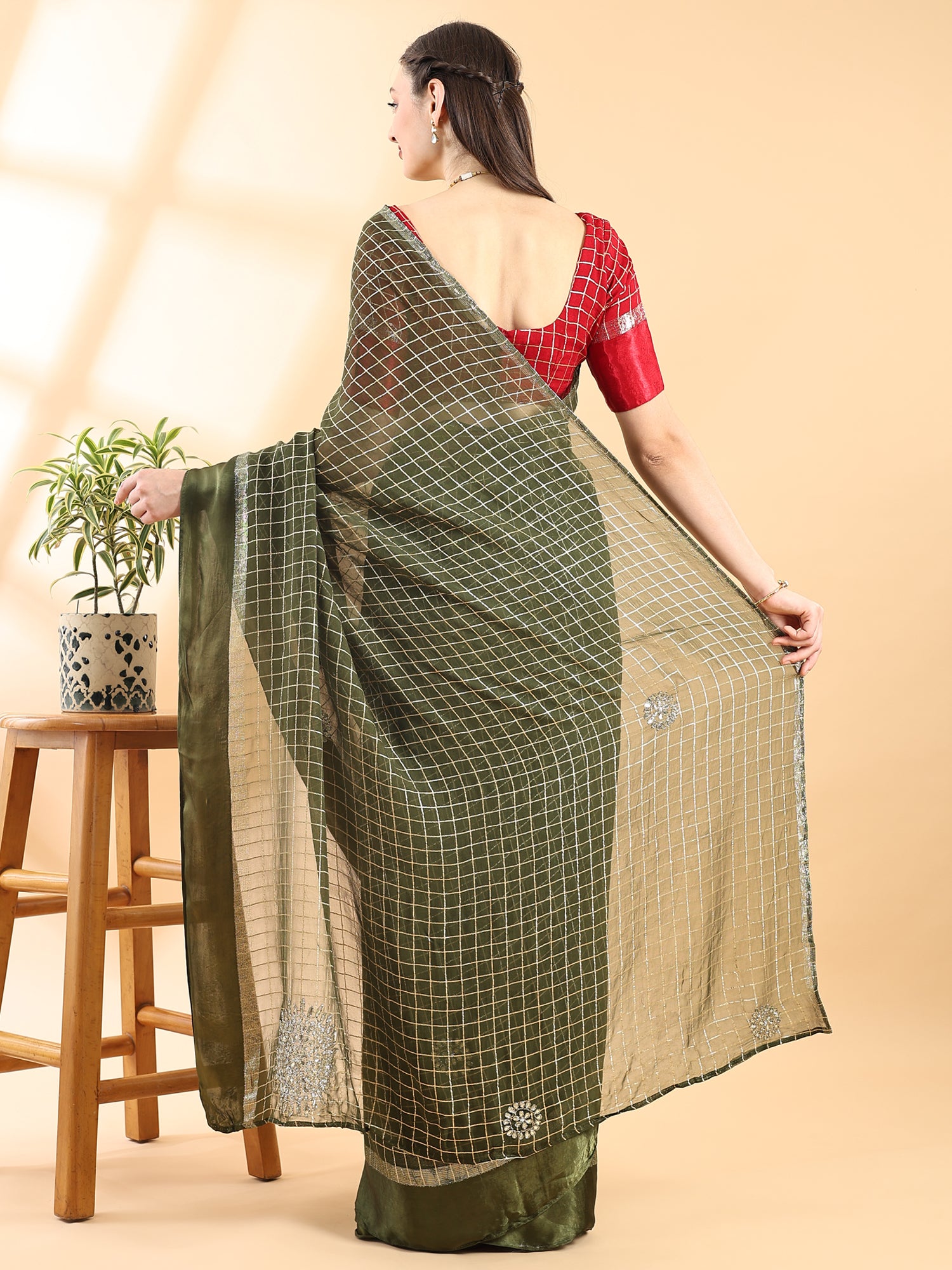 This green georgette saree features a checkered pattern the body, paired with a woven golden zari border and a satin chit pallu. Lightweight and fluid in drape, it offers comfortable wear with an elegant traditional touch. Ideal for festive occasions, family gatherings, and cultural celebrations, this saree blends classic Bandhani artistry with refined detailing.