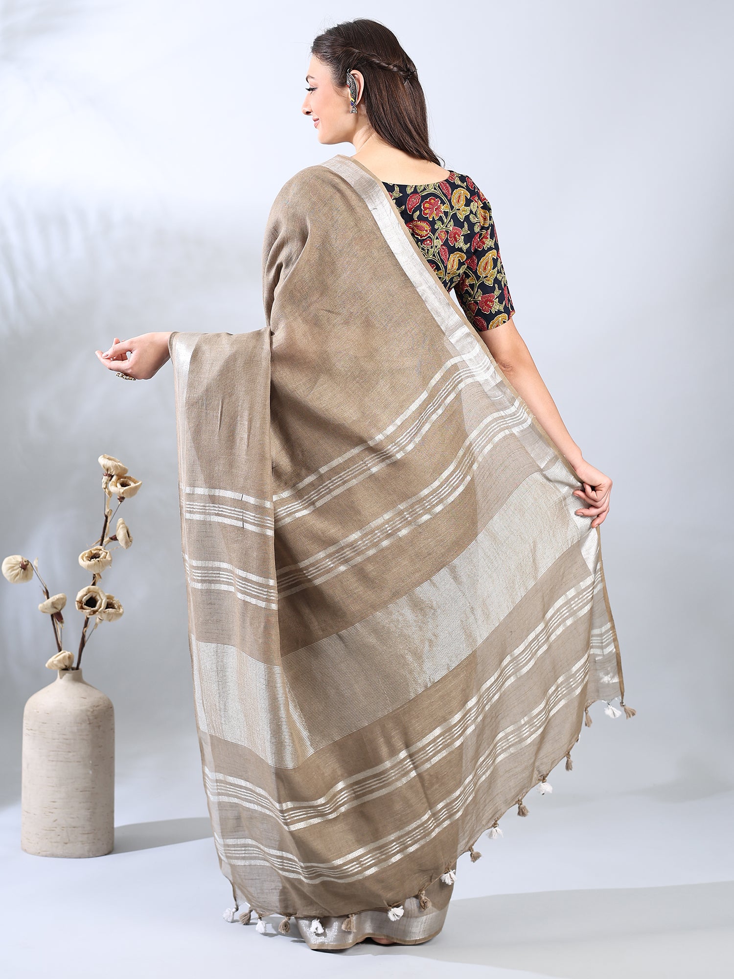 Light Brown Cotton Linen Saree with Silver Zari Border