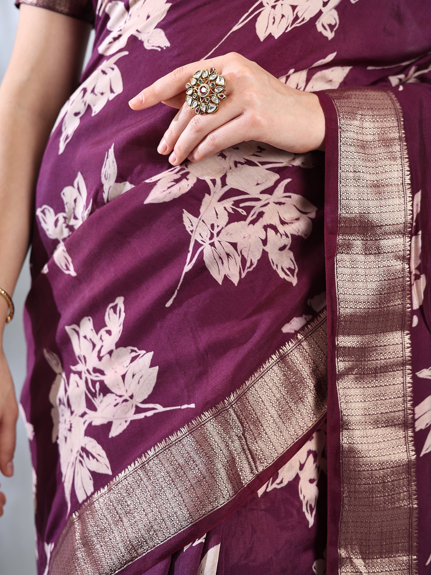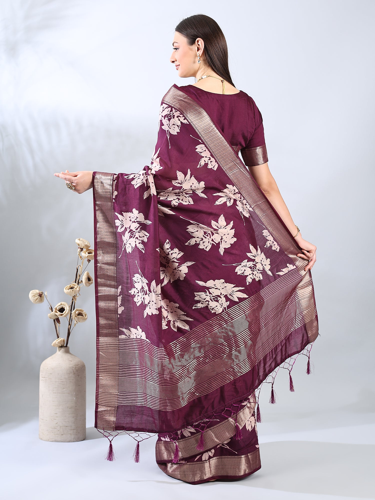 Step into effortless elegance with this Wine Assam Silk Saree, crafted in a soft and flowy fabric that feels gentle on the skin. Featuring delicate floral prints and a finely woven zari border, this lightweight saree drapes beautifully and stays comfortable all day. Ideal for small functions, weddings, and day-to-evening occasions, it offers a graceful blend of style and ease.